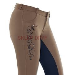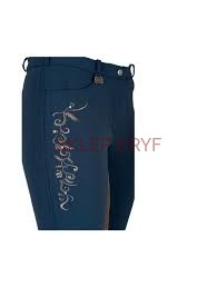 Dodatkowo ozdobiono go połyskującymi cyrkoniami. Bryczesy te posiadają pełny klasyczny lej oraz elastyczne zakończenie nogawek.