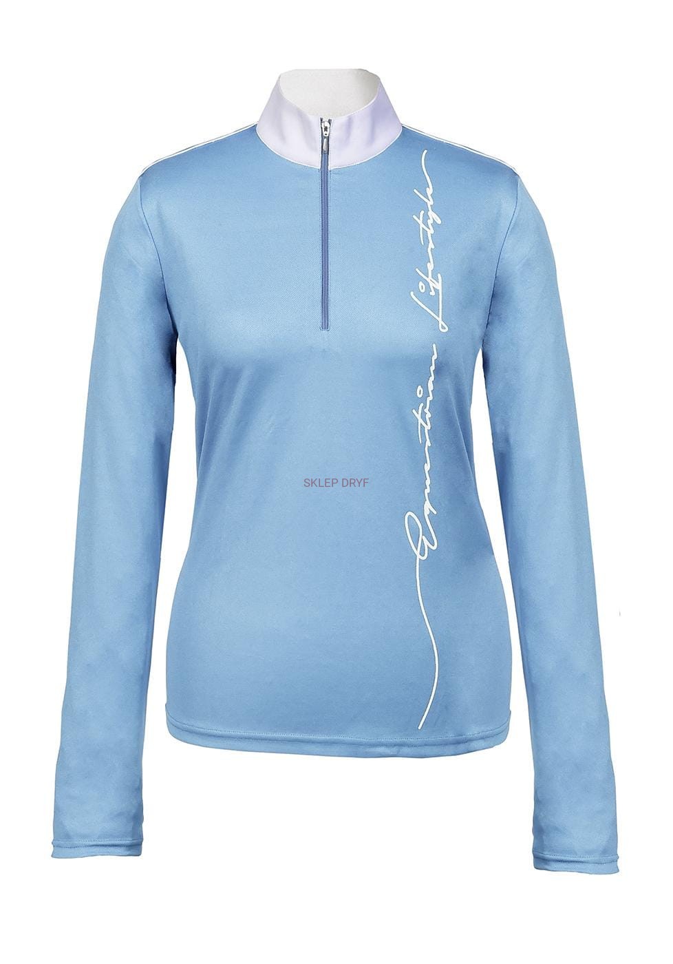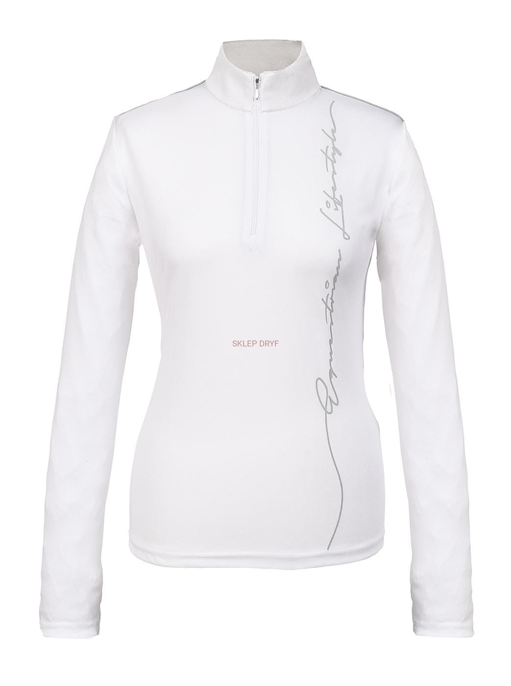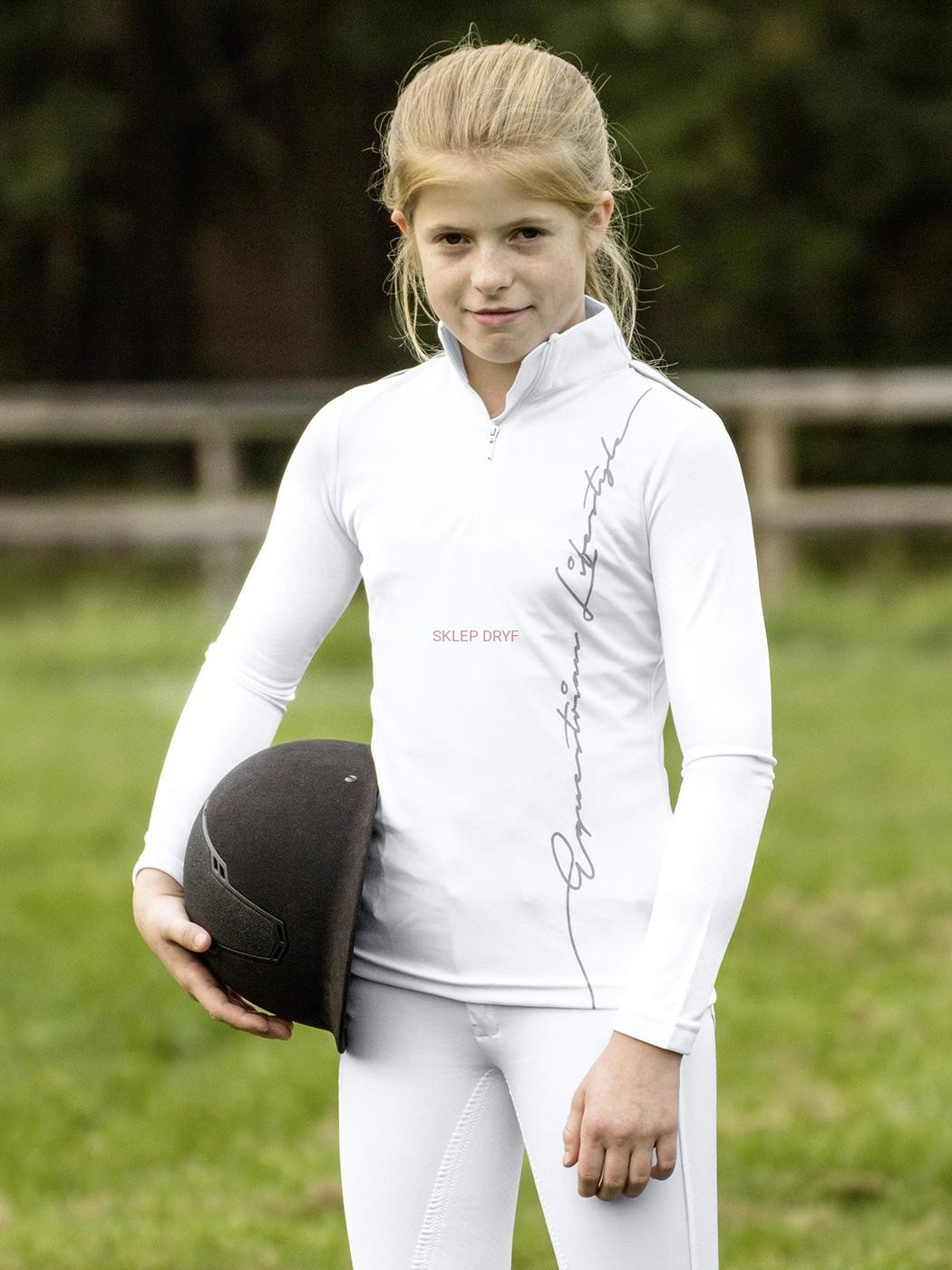 Młodzieżowa sportowa koszulka konkursowa z długim rękawem, z wcięciem w talii z przodu zapinana na zamek błyskawiczny i z białą stójką.