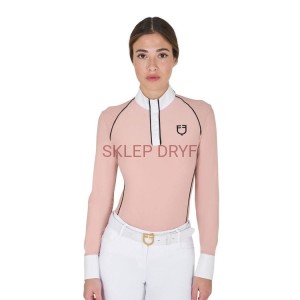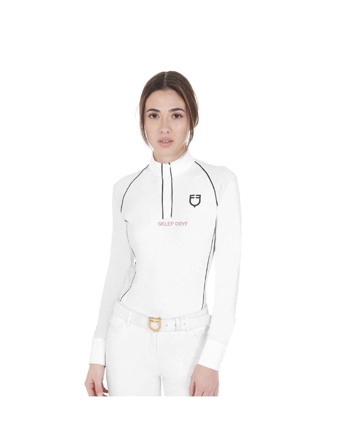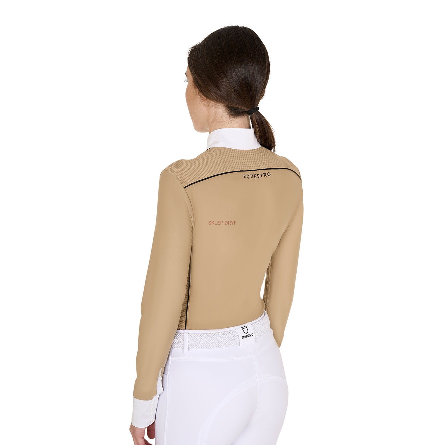 Koszulka Competition damska z długim rękawem o dopasowanym kroju, wykonana z dbałością o szczegóły, łącząca styl i wydajność. Wysokiej jakości techniczny materiał sprawia, że jest to idealny strój na zawody. Posiada również wstawki z siateczki, które nie tylko nadają nowoczesny charakter, ale także zapewniają optymalną oddychalność podczas aktywności. Projekt ma podkreślać elegancję i wyrafinowanie zawodniczek. Stylowy kołnierzyk typu stójka i zapięcie na guziki, a także kontrastowe lamówki dodają oryginalności. Mankiety posiadają regulowane zapięcie, co zapewnia idealne dopasowanie, a nadrukowany napis Equestro wzdłuż rękawa dodaje odrobinę elegancji.