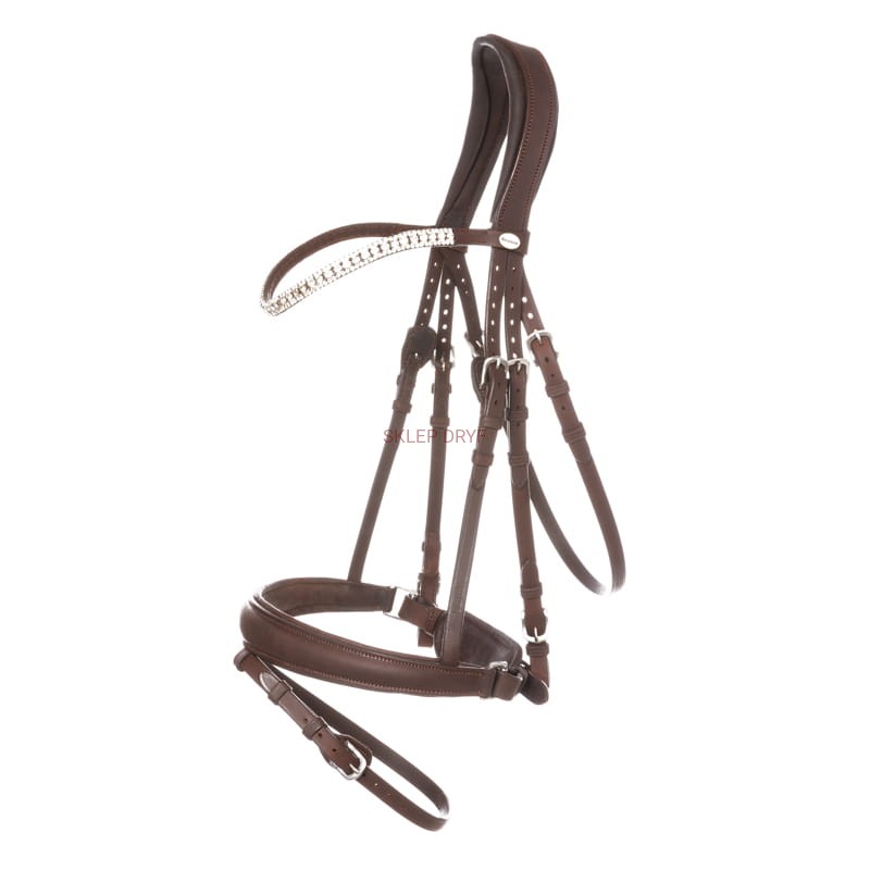 Ogłowie ma szwedzką kombinację czyli jest regulowane z obu stron. Nachrapnik bardzo miękki wykonany z olejowanej skóry i posiada system (KavalSH4) czyli odpinany pasek twz. skośnik bez widocznego uchwytu. Wygięty pasek podgardlany daje lepsze dopasowanie. Anatomicznie ukształtowany, bardzo miękko wyściełany nagłówek daje zmniejszony i równomierny nacisk na potylicę konia. Ładnie opadający naczółek z dużymi i małymi kryształkami w kolorze białym sprawia że ogłowie to jest bardzo eleganckie.