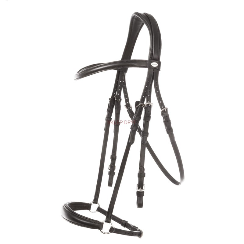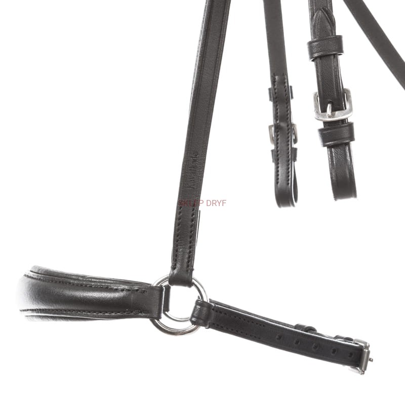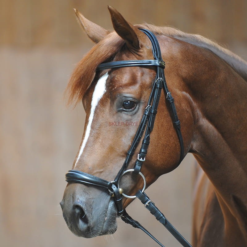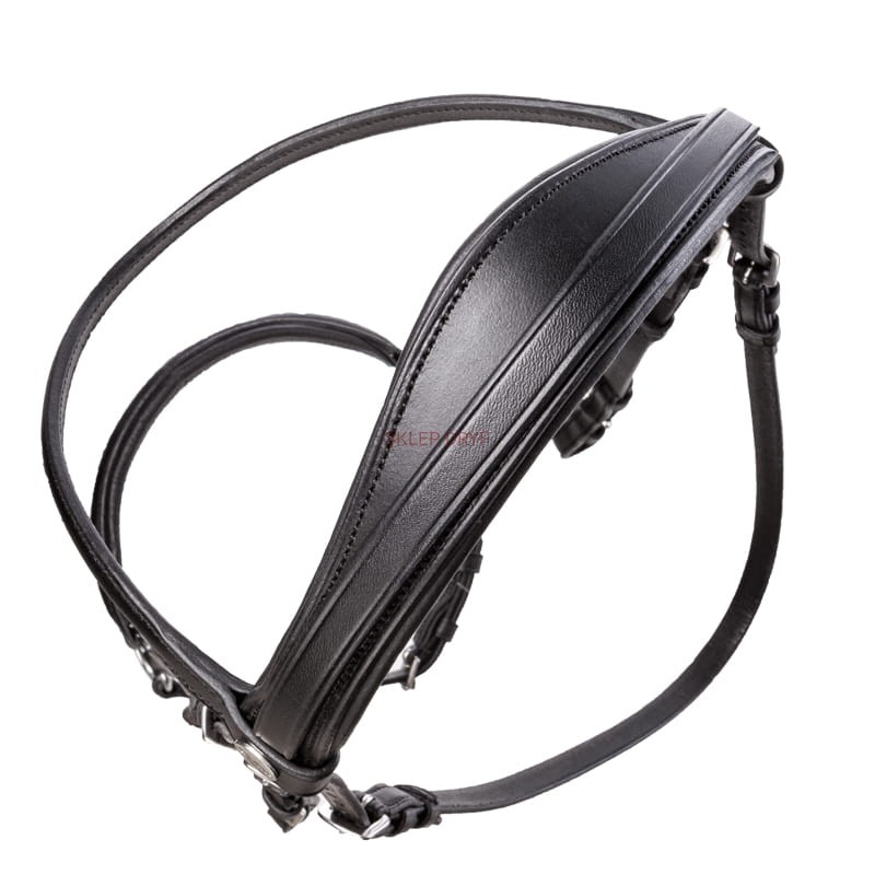 Nagłówek ma anatomiczny kształt i jest miękko wyściełany. Naczółek na głowę jest prosty bez ozdób i ma lekko opadający krój. W komplecie są wodze parciane ze stoperami.
