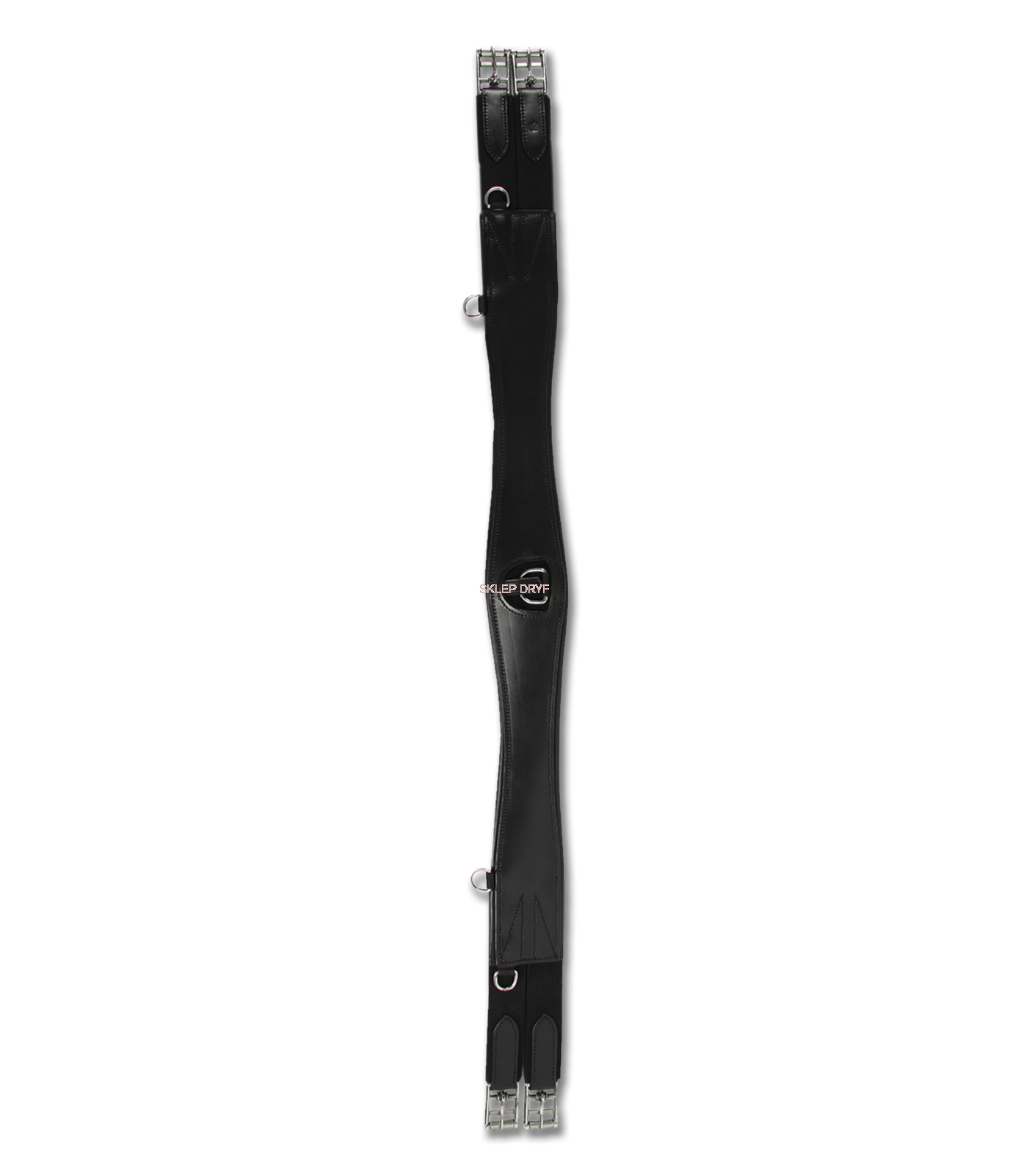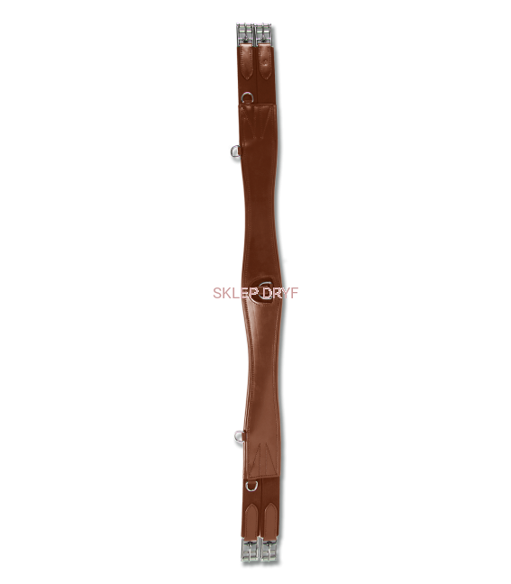 Popręg wykonany z wyjątkowo miękkiej skóry, zapobiegającej otarciom i uciskom. Wytrzymały i utrzymujący swój kształt. Sprzączki ze stali nierdzewnej, elastyczne wstawki na jednym końcu, pierścień do mocowania wodzy pomocniczych.