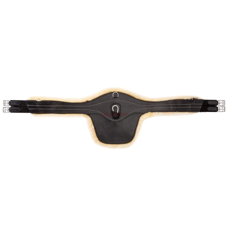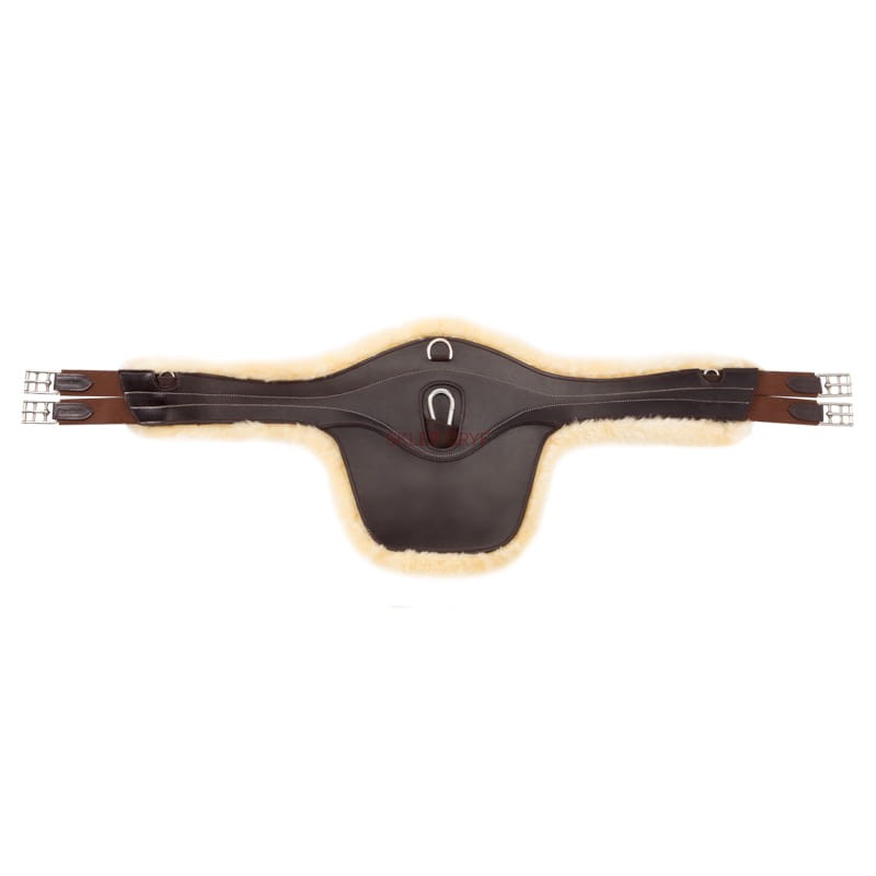 Popręg z fartuchem i futrem jagnięcym Excellence ze skóry jagnięcej jest szczególnie miękki, aby chronić konia przed otarciami i urazami podczas skoków przez przeszkody. Futro jagnięce można zdjąć do prania ponieważ jest przymocowane do popręgu za pomocą rzepów. Popręg posiada dwa karabińczyki pod spodem oraz dwa D-ringi po bokach. popręg posiada dwie podwójne gumy po obu stronach zapięcia w celu lepszego dopasowania.