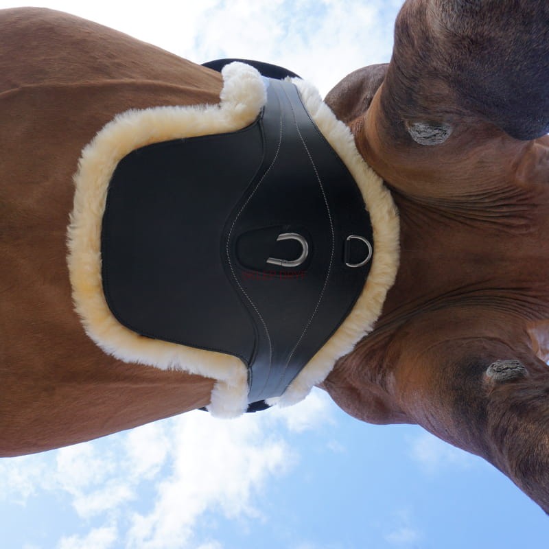 Popręg z fartuchem i futrem jagnięcym Excellence ze skóry jagnięcej jest szczególnie miękki, aby chronić konia przed otarciami i urazami podczas skoków przez przeszkody.