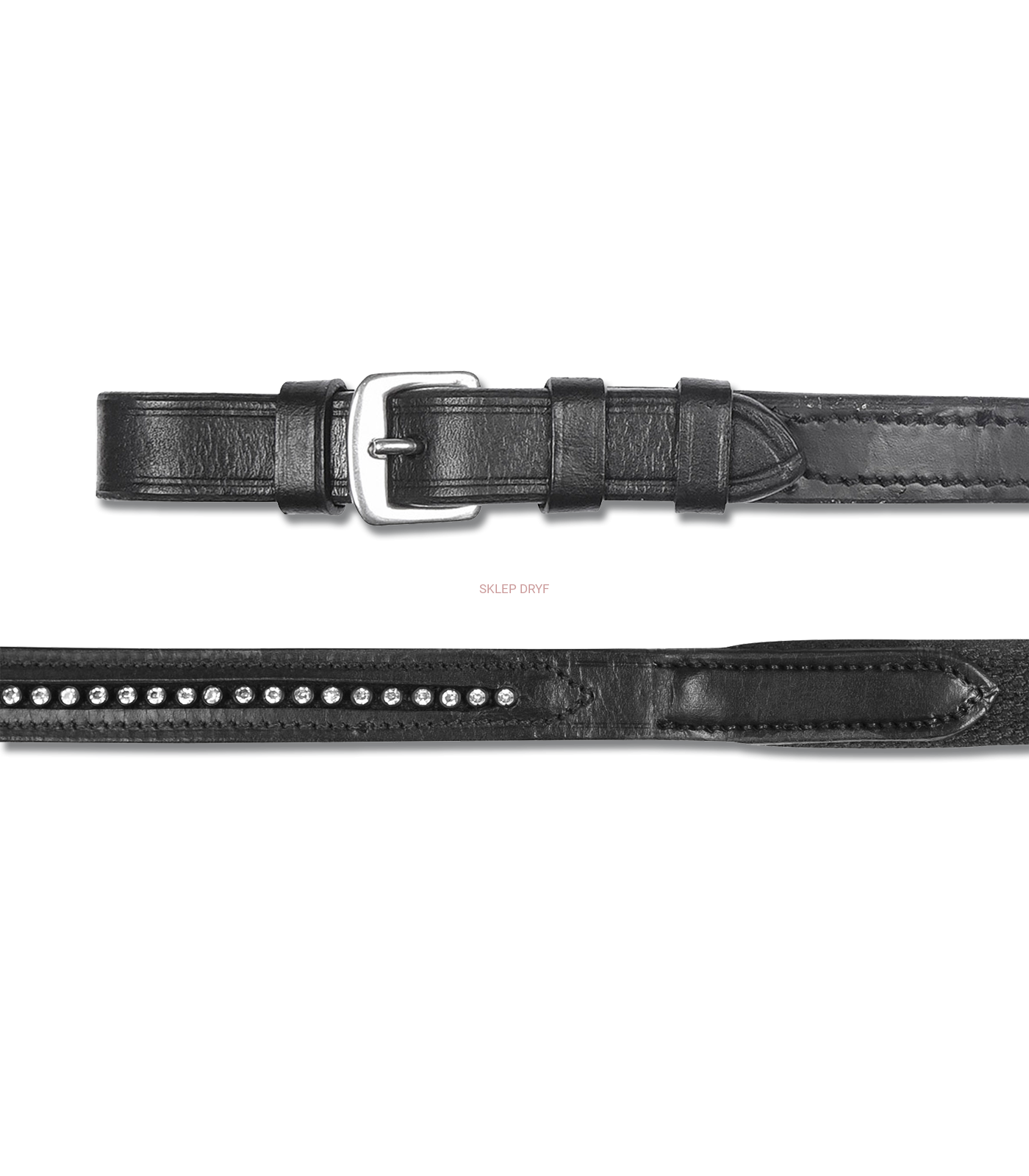 Wodze STAR z kryształkami. Wodze parciane z ozdobnymi cyrkoniami w odcinku przypinanym do kółka wędzidłowego i ze skórzanymi stoperami.